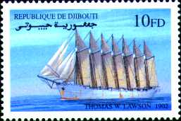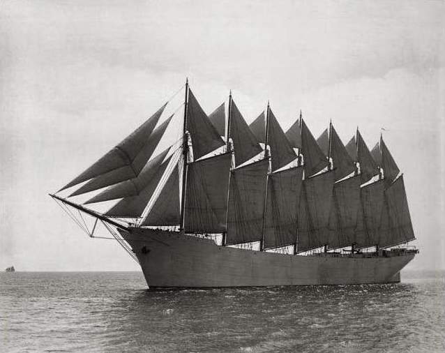 The Thomas W. Lawson was a seven masted steel-hulled schooner designed by Bowdoin B. Crowninshield, a naval architect known for his racing yachts. Built by the Fore River Ship & Engine Building Co., Quincy, MA, in 1902 for Coastwise Transportation Co. (John G. Crowley), Boston, at a cost of $258,000. The contract was signed on June 25, 1901, and the new ship was launched on July 10 1902. Designed as a coal ship for moving cargoes of coal along the East Coast, the Lawson could deliver 11,000 tons of coal a trip. Her design was an extreme attempt to keep sail viable in the coastal trade against competition from steam vessels. She had the distinction of not only being the only seven-masted schooner built but also the largest schooner ever built. The ship was named after the Boston millionaire stockbroker and yachtsman Thomas W. Lawson. Her ship handling was stated to be sluggish and difficult to maneuver, best stated as being "like a beached whale” and had "the lines of a canal barge, and about as sweet as a bath tub”. Her masts, each of which was 193 feet high were called fore, main, mizzen, no. 4, no. 5, no. 6, and spanker. She carried 26 sails in all, 7 gaff sails, 7 topsails, 7 staysails and 5 jibs, with a total area of 43,000 sq feet or approx. one acre of sail. The sails were made by the sailmaking firm E.L. Rowe & Son of Gloucecester, MA and weighted 18 tons. To handle this large quantity of canvas the Lawson had a crew of only 16, aided by a steam donkey engine that drove the hoisting winches and assisted with the steering. She was a very unique vessel. The lower parts of her seven masts were of steel while the upper parts were of pine. She had a double cellular bottom, that was 4 feet deep that held 1,000 tons of water ballast plus a trimming tank at each end of the vessel. Could this have been the first double-hull tanker? The schooner however proved so unhandy because she drew too much water for the ports she was intended to serve. In 1906 she was refitted at the Newport News Shipbuilding & Drydock Co. for use as an oil tanker under charter to Sun Oil Company, to haul bulk oil from Texas to the Eastern Seaboard. The topmasts were also removed at that time and the lower masts were used to vent oil gases from the holds. On November 19, 1907, while chartered as an oil tanker to the Anglo-American Oil Co. (part of the Standard Oil conglomerate), she sailed from Philadelphia for London with 58,300 bbls. of parrafin oil. Caught in a succession of winter gales, her hull and masts provided so much windage that she reportedly made twelve knots under bare poles. On December 13, she was riding out a gale off the Scilly Isles (south of England) when she dragged her anchors and broke up on western rocks of Hellweather's Reef, with the loss of 15 of the 17-member crew. Captain George Dow and engineer Edward Rowe were the survivors. Also lost in this mishap was pilot William Thomas Hicks. This grounding resulted in the first case of oil pollution in the Channel, exactly 60 years prior to the ‘Torrey Canyon’.