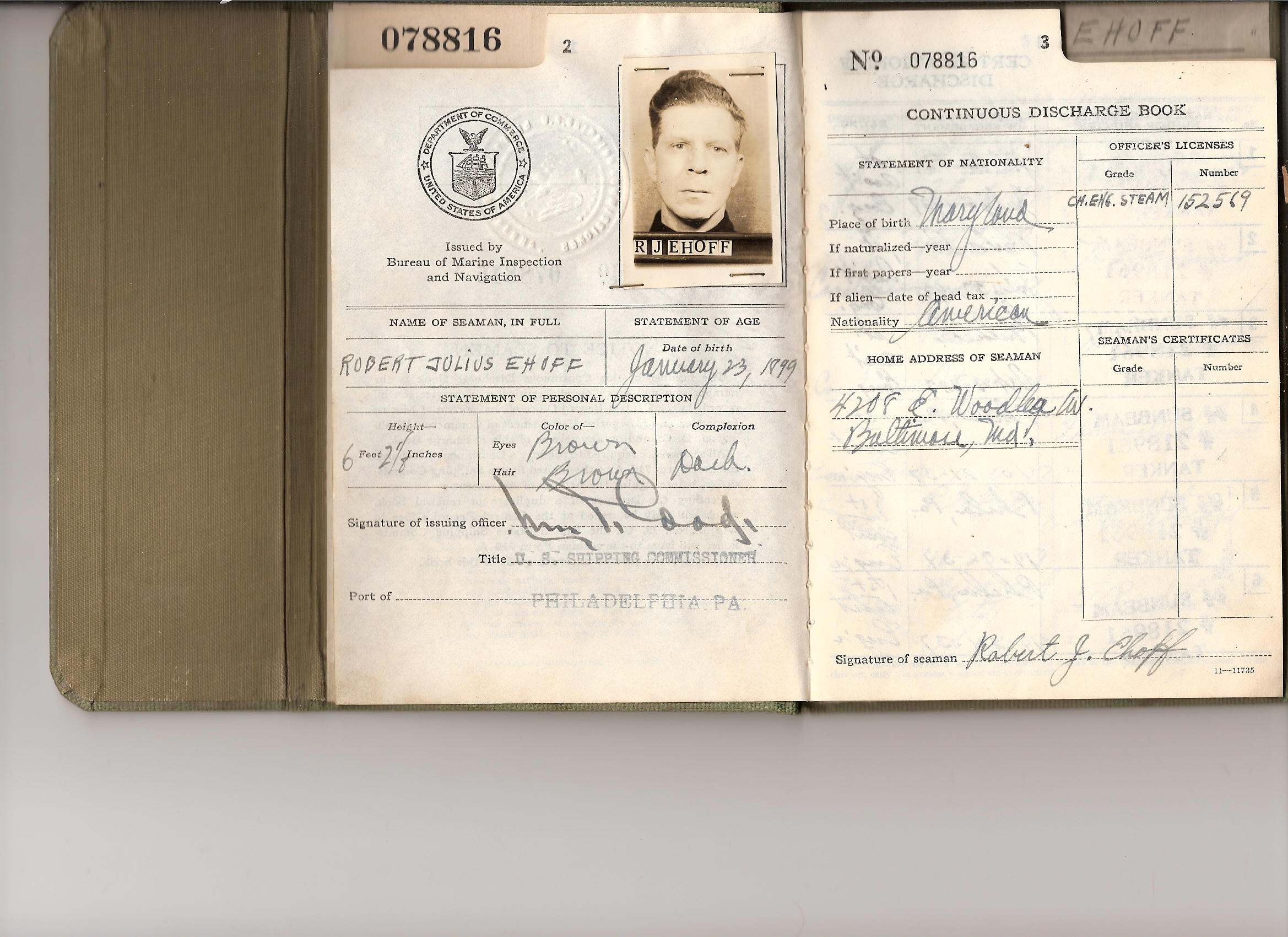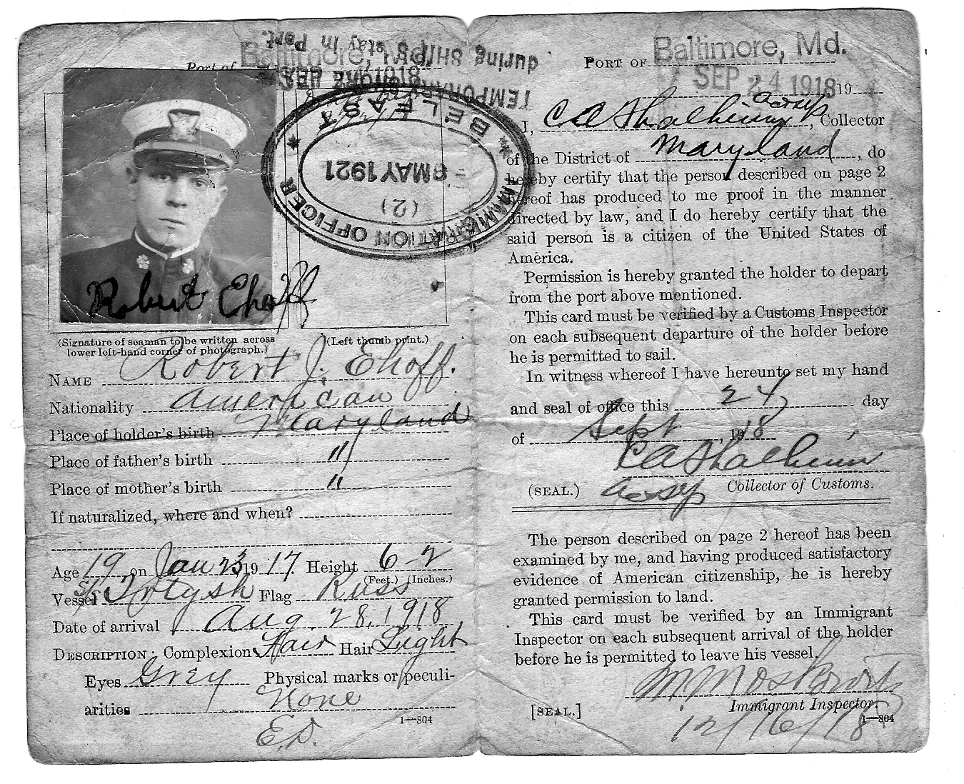 My maternal grandfather, Robert Julius Ehoff, born in 1899 in Baltimore,