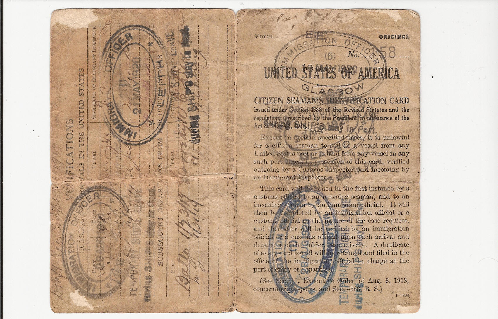 ID card from a Russian ship 1918-1921 with stamps for a number of UK ports