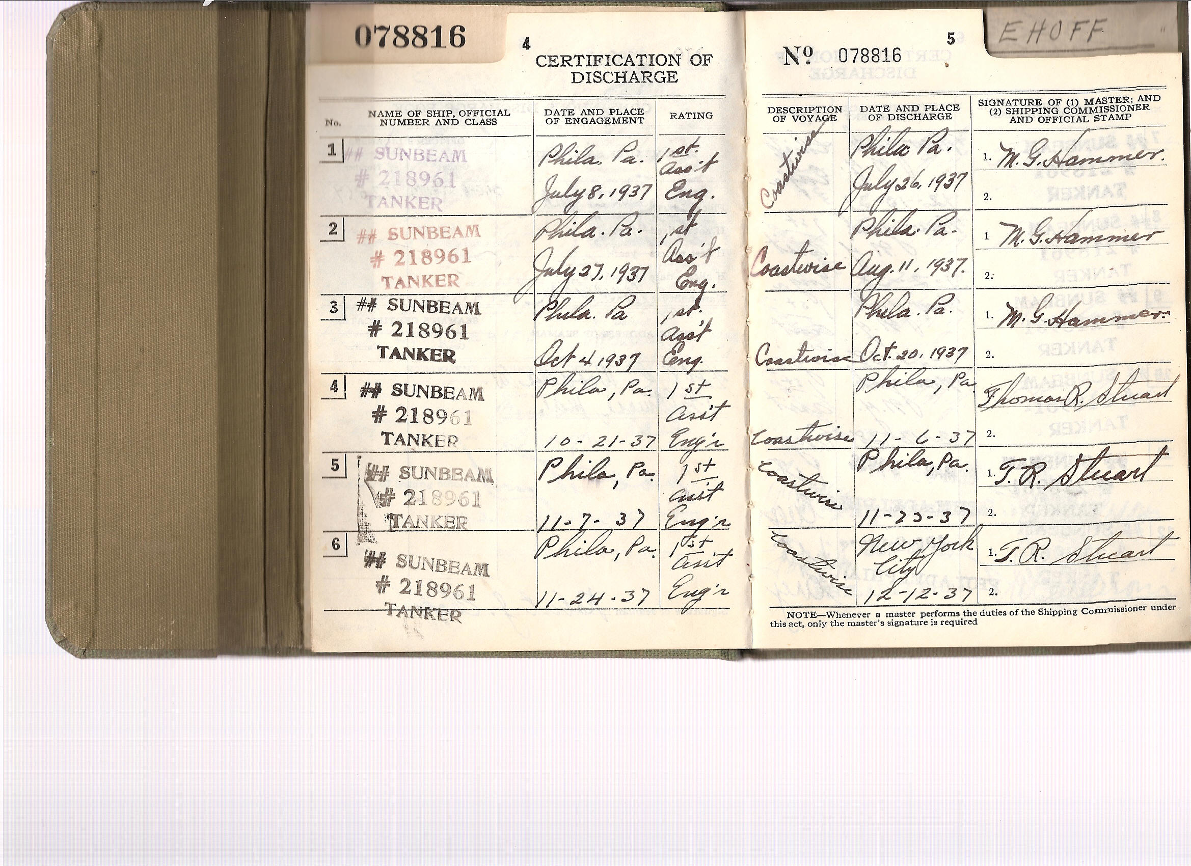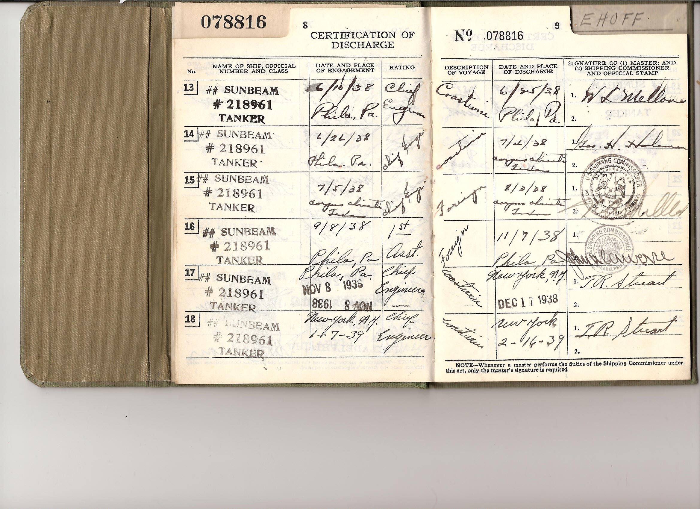 1937-39, he shipped on the Sunbeam 19 times as 1st Asst. or Chief and the
