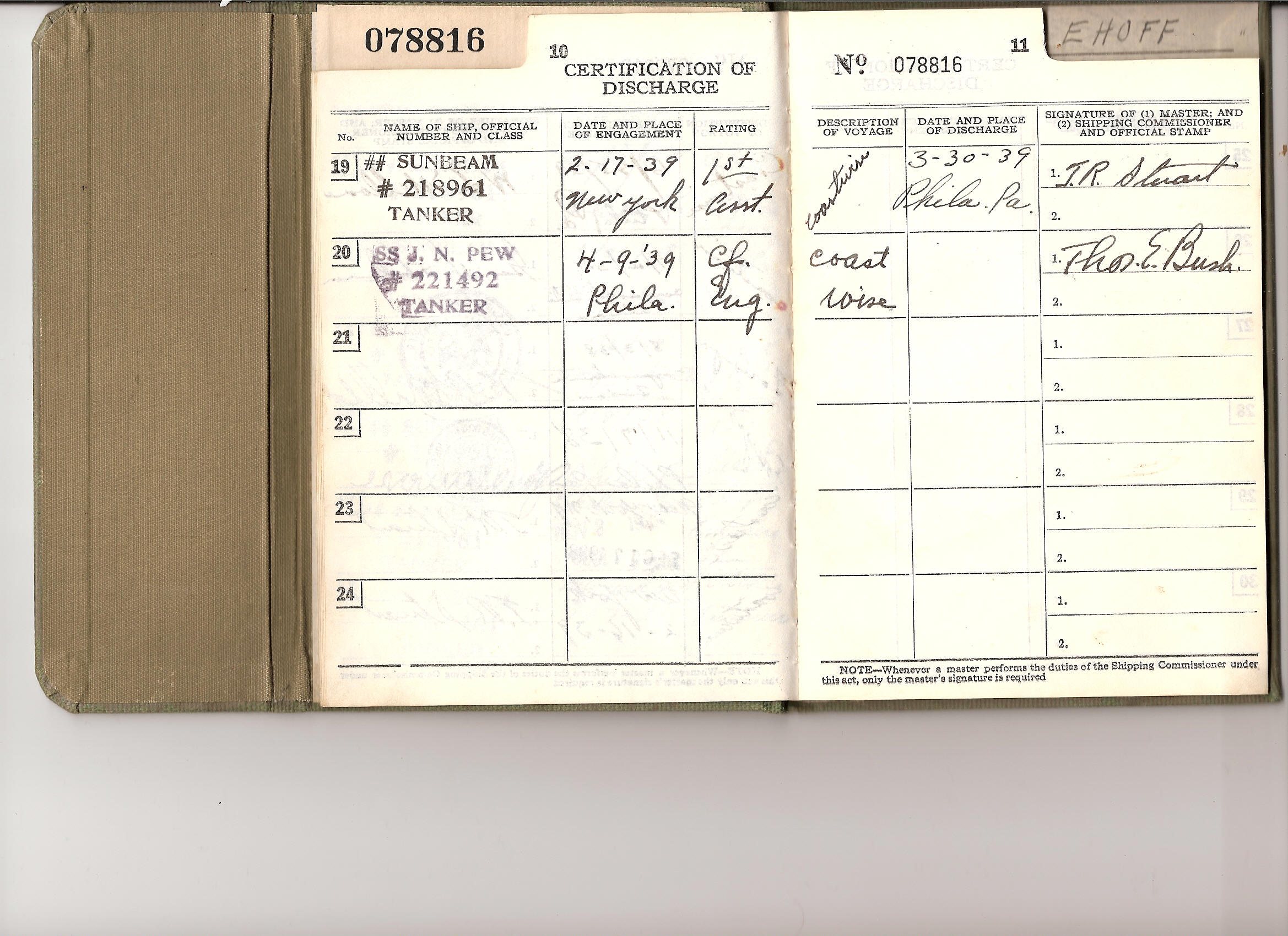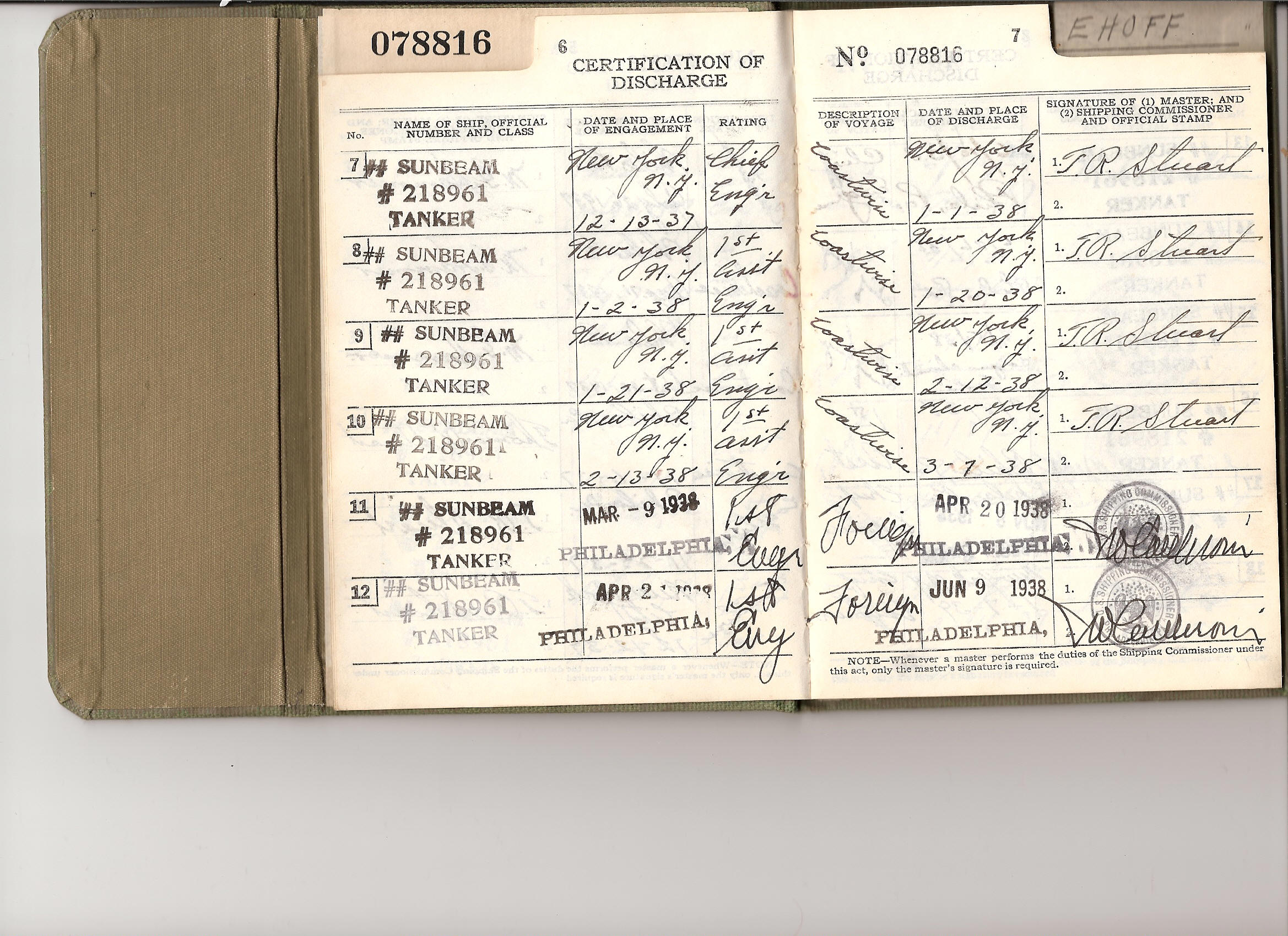 | Scans of his Continuous Discharge Book from late 1930's which show that between 1937-39, he shipped on the Sunbeam 19 times as 1st Asst. or Chief and the Pew once as Chief. He had ill health and was taken off the Pew to the hospital so his last recorded trip is not complete. There are a number of Master's signatures in his book for the various voyages. |